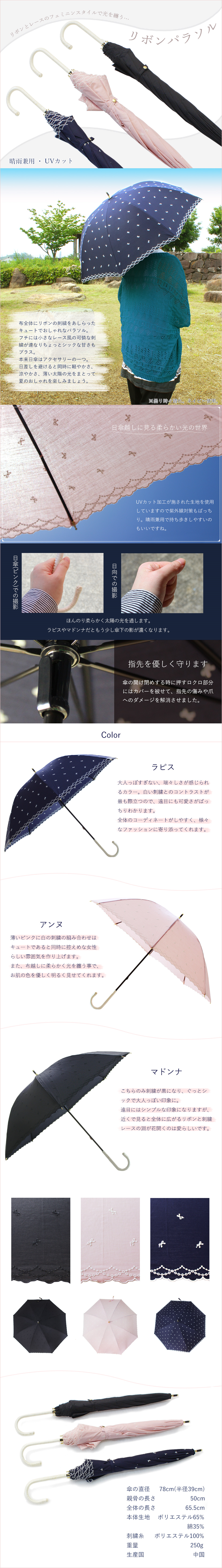 布全体にリボンの刺繍をあしらったキュートでおしゃれなパラソル。