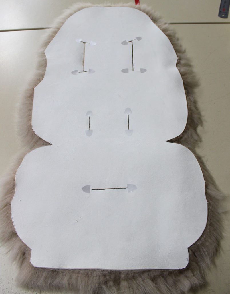 1匹もののムートンフリース(長毛リネンカラー)を贅沢に使い、お手持ちのベビーカーにジャストフィットする専用シートを作りたいというリクエストをいただきました。